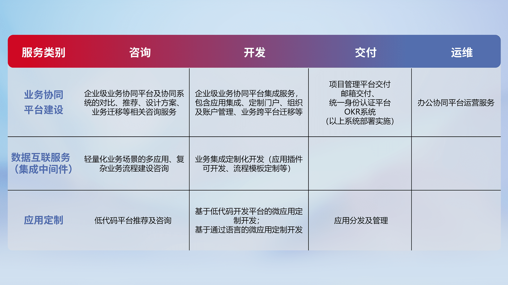 针对钉钉、、企微、、、、IDaas等平台级产品提供产品的规划、、、方案、、、、交付、、、、定制化开发等服务,,,,实现如统一协同办公、、智能客户服务、、、、混合会议管理、、、智能数据查询、、等业务场景,,,实现数字化转型。。。。